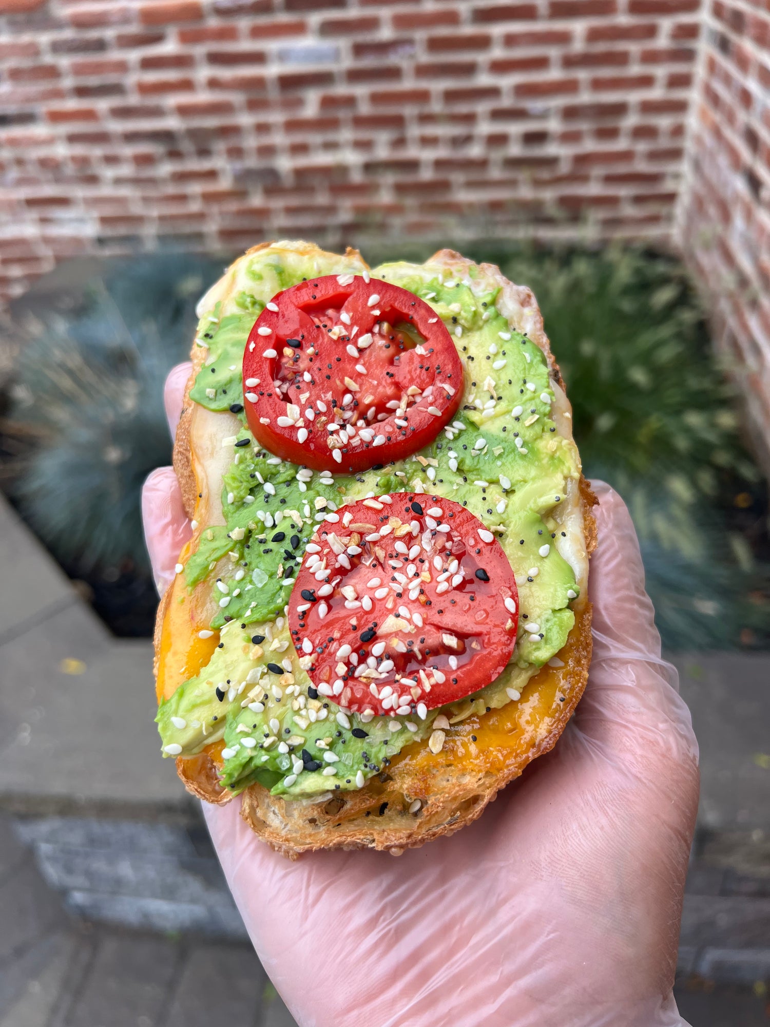 Fresh baked rosemary bread topped with all fresh ingredients.